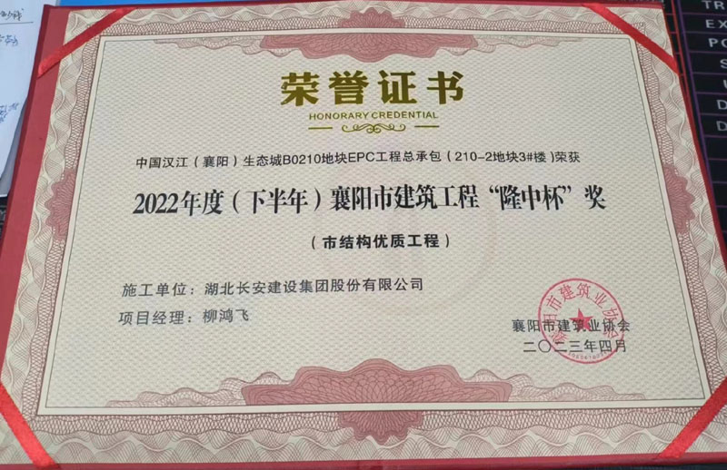 襄陽生態城B0210地塊(210-2地塊3#樓)榮獲“隆中杯”獎(市結構優質工程)